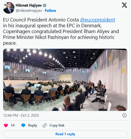 Avropa İttifaqı Şurasının Prezidenti Antonio Koşta Danimarkanın paytaxtı Kopenhagendə keçirilən Avropa Siyasi Birliyi sammitində çıxışında Prezident İlham Əliyevi və Baş nazir Nikol Paşinyanı tarixi sülhə nail olduqlarına görə təbrik edib.