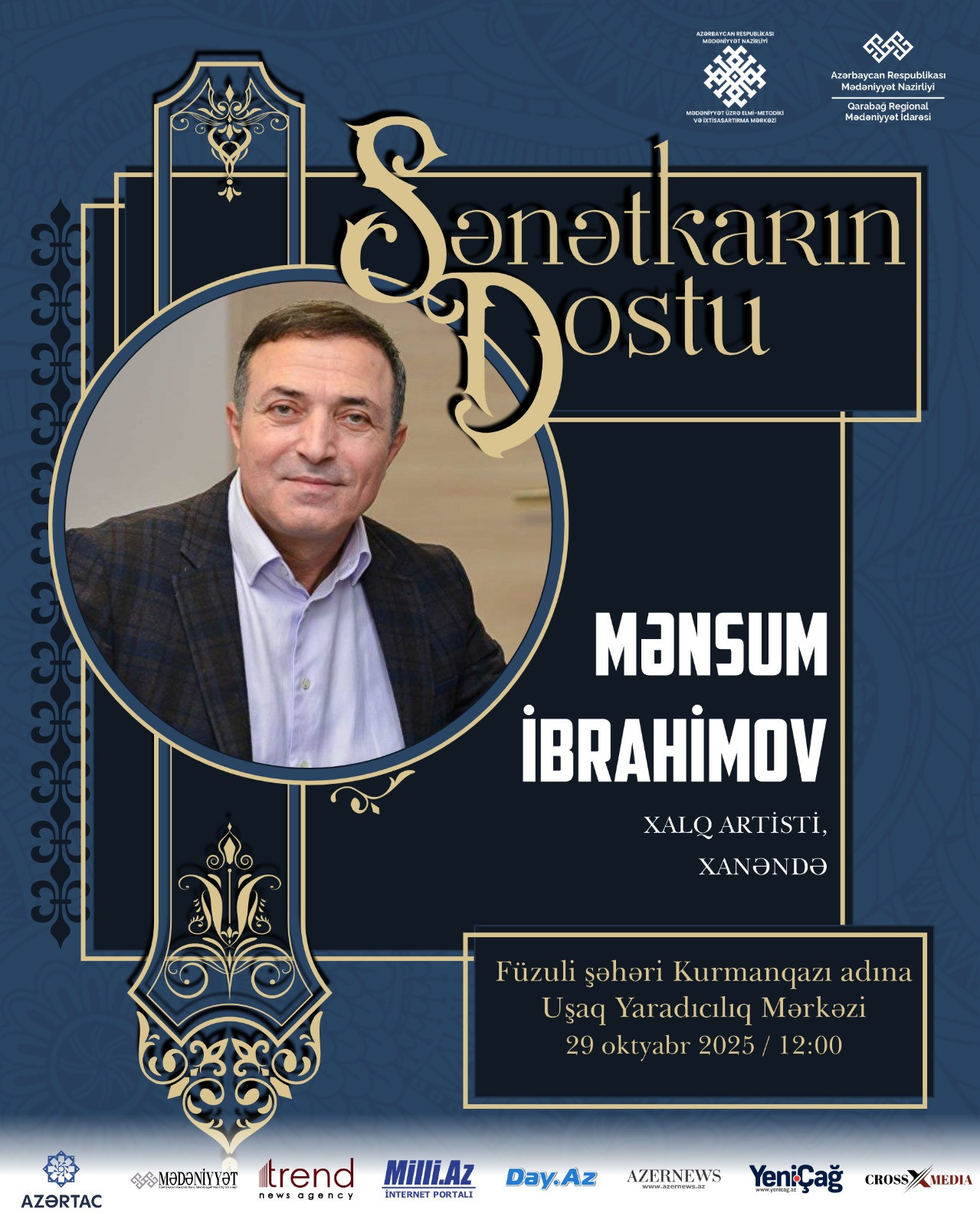 “Sənətkarın dostu” layihəsinin növbəti görüşü oktyabrın 29-da Füzuli şəhərindəki Kurmanqazı adına Uşaq Yaradıcılıq Mərkəzində Xalq artisti, xanəndə, pedaqoq Mənsum İbrahimovun iştirakı ilə baş tutacaq.