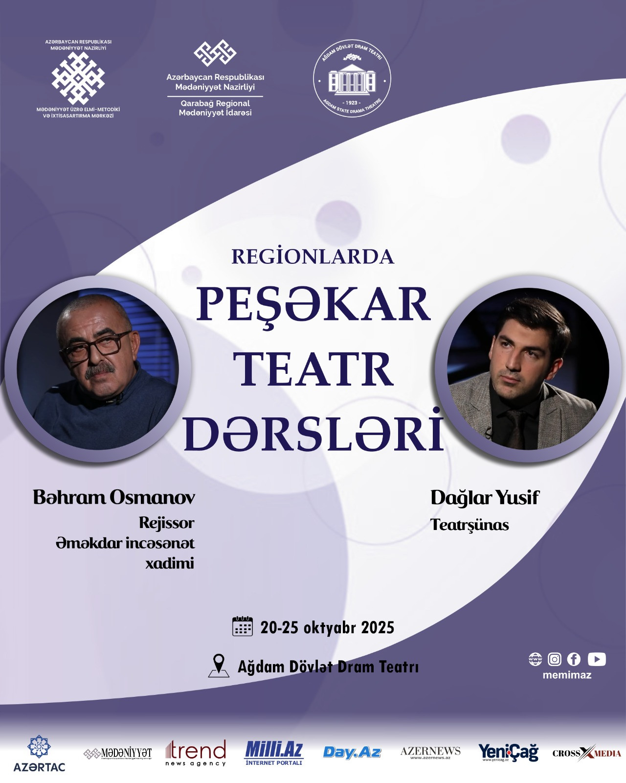 20–25 oktyabr tarixlərində Ağdam Dövlət Dram Teatrında, 26–31 oktyabr tarixlərində isə Füzuli Dövlət Dram Teatrında “Regionlarda peşəkar teatr dərsləri” adlı silsilə tədbirlər keçiriləcək.
