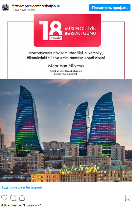 Azərbaycanın Birinci vitse-prezidenti Mehriban Əliyeva 18 oktyabr Müstəqilliyin Bərpası Günü münasibətilə paylaşım edib.