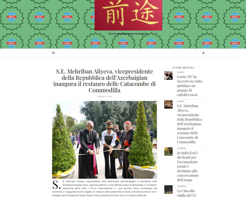 İtaliyanın “Eurasiaticanews” portalının materialında isə Azərbaycanın Birinci vitse-prezidentinin oktyabrın 16-da Müqəddəs Kommodilla katakombalarının bərpası layihəsinin açılış mərasimində iştirak etdiyi və həyata keçirilmiş bərpa işləri ilə tanış olduğu bildirilib. Qeyd olunub ki, mərasimdə Vatikanın Müqəddəs Arxeologiya üzrə Pontifik Komissiyasının prezidenti Monsenyor Paskuale Yakobone, Mədəniyyət və Müqəddəs Arxeologiya üzrə Pontifik Komissiyasının sabiq prezidenti kardinal Canfranko Ravazi və Roma şəhərinin VIII bələdiyyəsinin prezidenti Amedeo Çakkeri də iştirak edib.