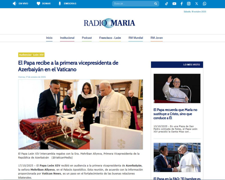 Argentinanın “Radio María” xəbər və onlayn radio portalı da Mehriban Əliyeva Papa XIV Leonun görüşünü diqqətdə saxlayıb. Qeyd olunub ki, bu görüş Vatikan ilə Azərbaycan arasında yaxşı ikitərəfli münasibətlərin möhkəmləndirilməsi yolunda mühüm bir addımdır.