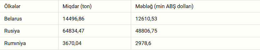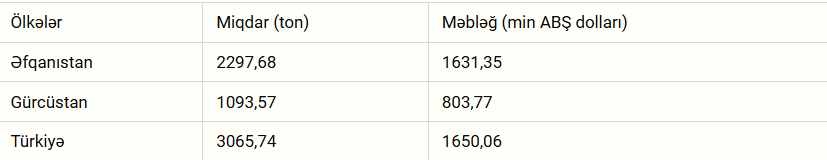 Məlumata görə, bu göstərici ötən ilin eyni dövrü ilə müqayisədə həcm ifadəsində 36,1 min ton və ya 1,8 dəfə, dəyər baxımından isə 25,9 milyon ABŞ dolları və ya 1,7 dəfə çoxdur.
