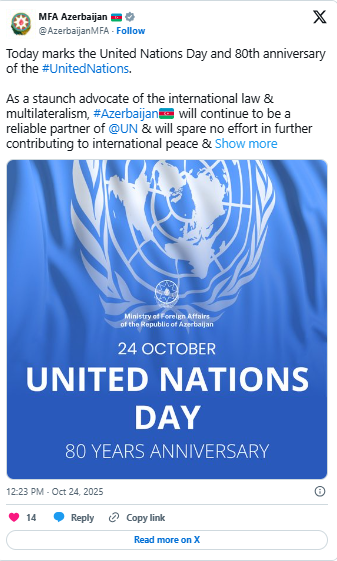 Azərbaycan Xarici İşlər Nazirliyi Birləşmiş Millətlər Günü və Birləşmiş Millətlər Təşkilatının 80 illiyi münasibətilə beynəlxalq təşkilatı təbrik edib.