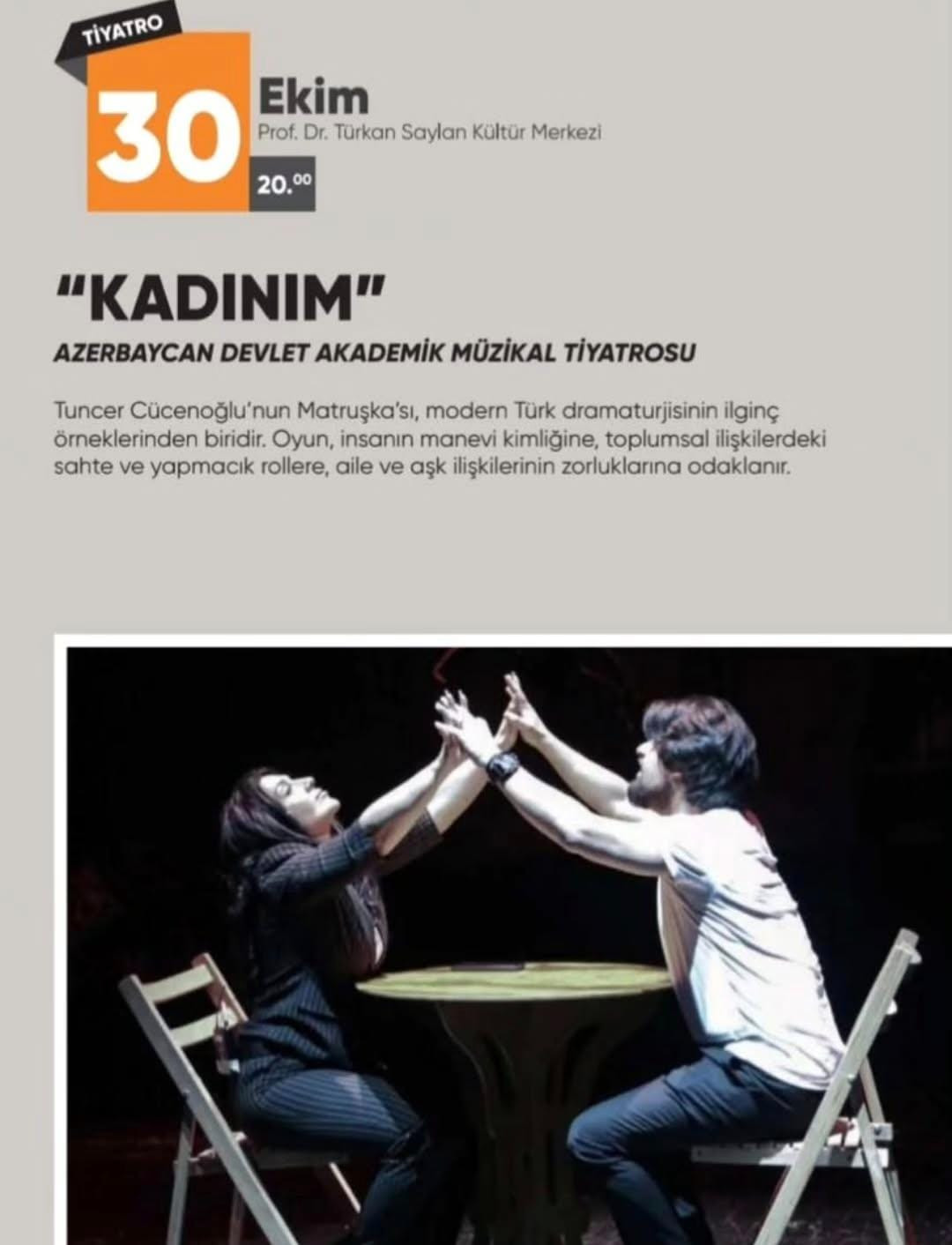 Azərbaycan Dövlət Akademik Musiqili Teatrı Türk dünyasının tanınmış yazıçı-dramaturqu Tunçər Cücenoğlunun “Matroşka” pyesi əsasında hazırlanan “Qadınım” tamaşasını 30 oktyabrda İstanbulda nümayiş etdirəcək. Crossmedia.az xəbər verir ki, Musiqli melodram janrında səhnələşdirilən əsərin quruluşçu rejissoru Prezident mükafatçısı İradə Gözəlovadır.