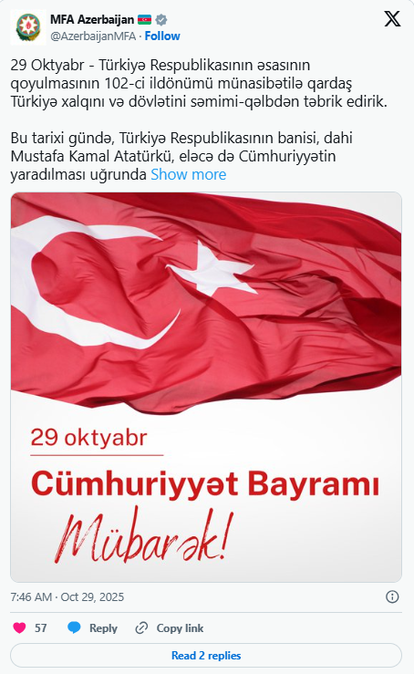 "29 Oktyabr - Türkiyə Respublikasının əsasının qoyulmasının 102-ci ildönümü münasibətilə qardaş Türkiyə xalqını və dövlətini səmimi-qəlbdən təbrik edirik. Bu tarixi gündə, Türkiyə Respublikasının banisi, dahi Mustafa Kamal Atatürkü, eləcə də Cümhuriyyətin yaradılması uğrunda canlarını fəda etmiş şəhidlərimizi və qazilərimizi dərin ehtiramla yad edirik.