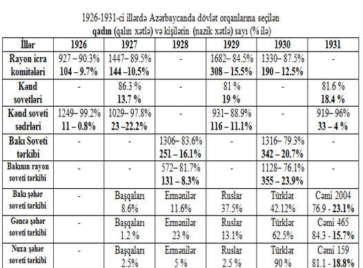 1929-1931 illərdə 324 qadın (əksəriyyəti azərbaycanlı) rəhbər vəzifəyə gətirilmişdi. Azərbaycan SSR-də digər respublikalardan fərqli olaraq daha çox qadın deputat seçilmişdir. 1939-cu il deputat seçkilərində Azərbaycanda seçilən deputatların təqribən 35% (8943) qadın idi. Lakin, dindar ailələr, bəy nəsilləri sinfi düşmən kimi ayrıseçkiliyə məruz qalır və təqib olunurdular.