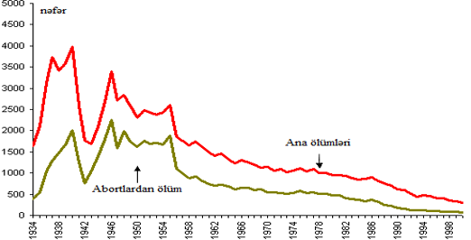1936-cı ildə abortların qadağan edilməsi, kriminal abortların meydana çıxmasına və qadın ölümlərinin artmasına şərait yaratdı. Rusiyada 1936-1955-cı illərdə qadın ölümlərinin səviyyəsi yüksək olmuşdur (diaqram 4.1). Çünki 1936-1955-cı illərdə SSRİ-də abortlar qanunla qadağan olunmuşdur.