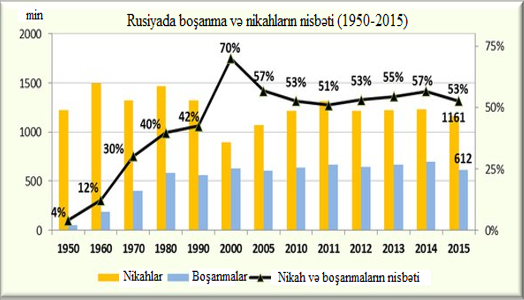 1950-2015-ci illərdə Rusiyada nikahlara görə boşanmaların həcminə diqqət yetirsək görərik ki, Rusiyada da boşanmalar 1965-1970-ci illərdən sonra sürətlə atmağa başlamış və 2000-ci ildə pik həddinə çatmışdır (70%). Lakin, 2000-ci ildən sonra bu göstərici enmək üzrə davam etsə də, nikahlara görə boşanmaların həcminin 53% olması çox neqativ bir göstəricidir.