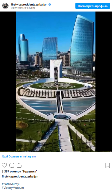 Azərbaycanın Birinci vitse-prezidenti Mehriban Əliyeva rəsmi "Instagram" hesabında Zəfər abidəsi və Zəfər muzeyindən paylaşım edib.