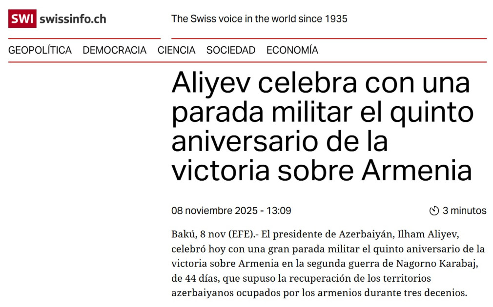 İspaniyanın EFE agentliyi də Hərbi parada xüsusi diqqət ayırıb. Agentliyin yayımladığı xəbərdə İkinci Qarabağ müharibəsində Qələbənin beşinci ildönümünə həsr olunan Hərbi paradda Türkiyə və Pakistan liderlərinin də iştirakı vurğulanıb. Xəbərdə əsasən Azərbaycan və Türkiyə prezidentlərinin, Pakistan Baş nazirinin fikirləri diqqətə çatdırılıb, liderlərin Azərbaycanın Qələbəsinin regionda sülh, inkişaf və əmin-amanlıq üçün yeni səhifə açması barədə fikirləri qeyd olunub. Bu xəbər İsveçrənin “Swissinfo.ch” nəşri tərəfindən də EFE-yə istinad olunaraq yayımlanıb.