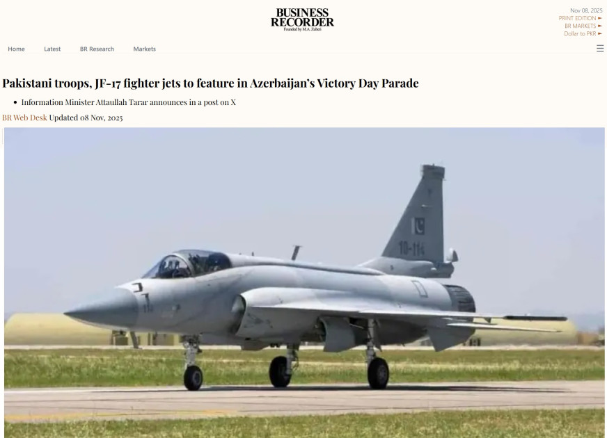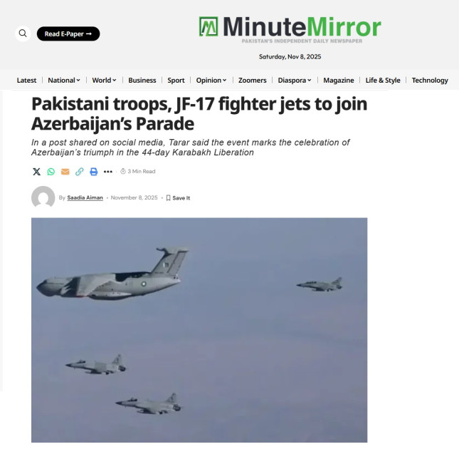 Pakistanın aparıcı media qurumları, o cümlədən “ARN News Centre”, “AAJ News (AAJ TV)”, “The Express Tribune”, “Brecorder”, “Geo News”, “24 News HD”, “Minute Mirror”, “Lead Pakistan”, “Dawn” televiziya və nəşrlərinin yayımladığı xəbərlərdə Hərbi paradın möhtəşəmliyi, Azərbaycan, Türkiyə və Pakistan hərbi qüvvələrinin birgə iştirakı, nümayiş olunan hərbi texnika və aviasiya qüvvələri barədə məlumat verilib. Xüsusi diqqət Azərbaycan Prezidentinin çıxışına yönəldilib, dövlətimizin başçısının Türkiyə və Pakistanın Vətən müharibəsi zamanı Azərbaycana qətiyyətli dəstəyi barədə fikirləri geniş işıqlandırılıb. Həmçinin, Prezident İlham Əliyevin Azərbaycanın ədalətli mübarizəsi zamanı göstərdiyi möhkəm dəstəyə görə Pakistana təşəkkür etdiyi, rəsmi İslamabadın Cənubi Asiyada regional sabitliyin təmin edilməsindəki rolunu yüksək qiymətləndirdiyi vurğulanıb. Xəbərlərdə Pakistanın Baş naziri Məhəmməd Şahbaz Şərifin paradda iştirakı xüsusi qeyd olunub, üç qardaş ölkənin ordularının sıx əməkdaşlığı diqqətə çatdırılıb. Pakistan mediasında paradın regional əməkdaşlıq və Cənubi Qafqazda sülh və sabitliyin güclənməsi baxımından əhəmiyyətini də ön plana çıxardığı qeyd olunub. “The Express Tribune” nəşri bu baxımdan Pakistan Baş nazirinin Hərbi paraddakı çıxışında “Bu, dostluq və regional həmrəyliyin əyani göstəricisidir” ifadəsini xüsusi vurğulayıb.