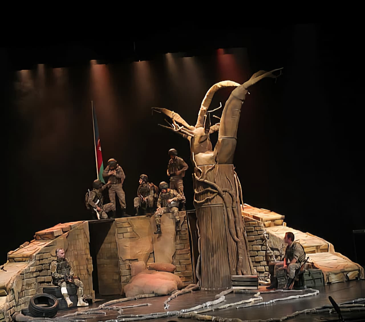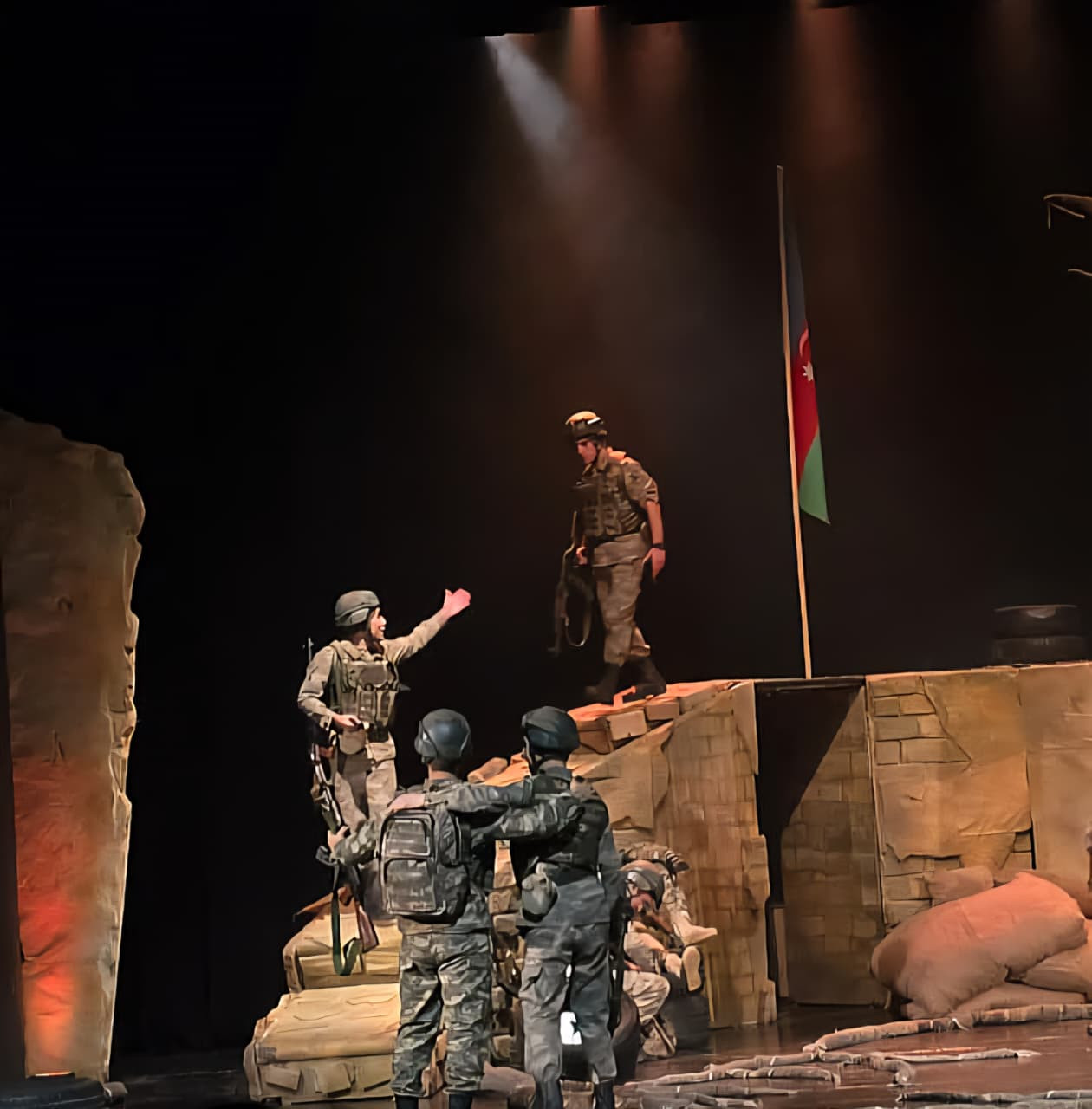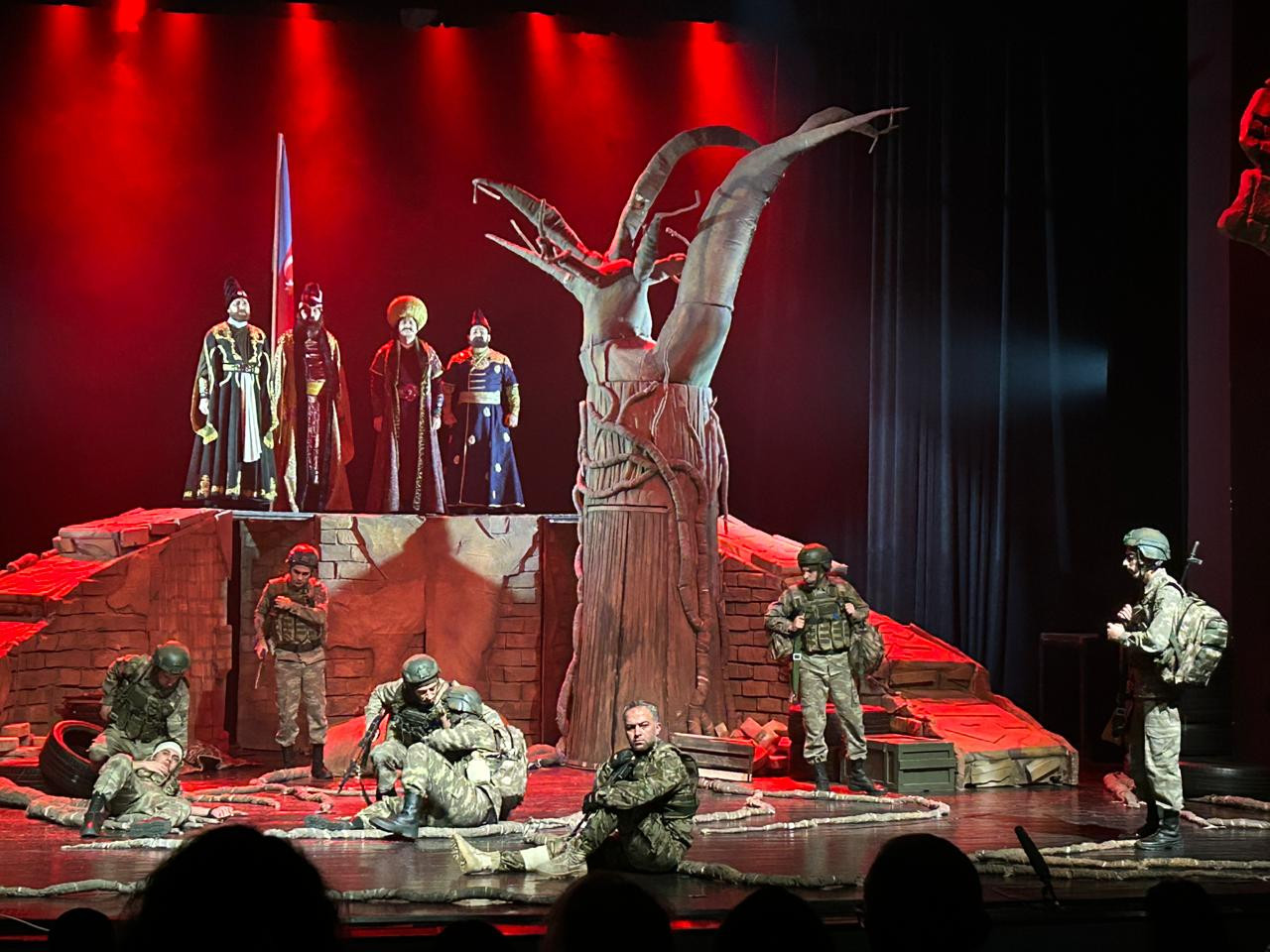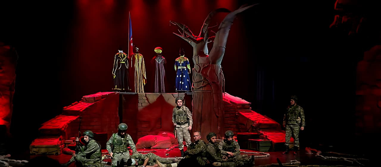 Tamaşa zamanı döyüş səhnələrinin səs effektləri, aktyorların emosional performansı, səhnə ritmi tamaşaçını bir anlıq teatr zalından çıxarıb 44 günlük savaşın içinə aparır.