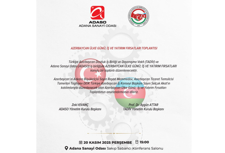 Türkiyənin cənubunda yerləşən Adana şəhərində noyabrın 20-də Azərbaycanın iqtisadi imkanlarına həsr olunmuş tədbir keçiriləcək. Təqdimatın təşəbbüskarları Türkiyə-Azərbaycan Dostluq, Əməkdaşlıq və Həmrəylik Fondu (TADİV) və Adana Sənaye Palatasıdır (ADASO).
