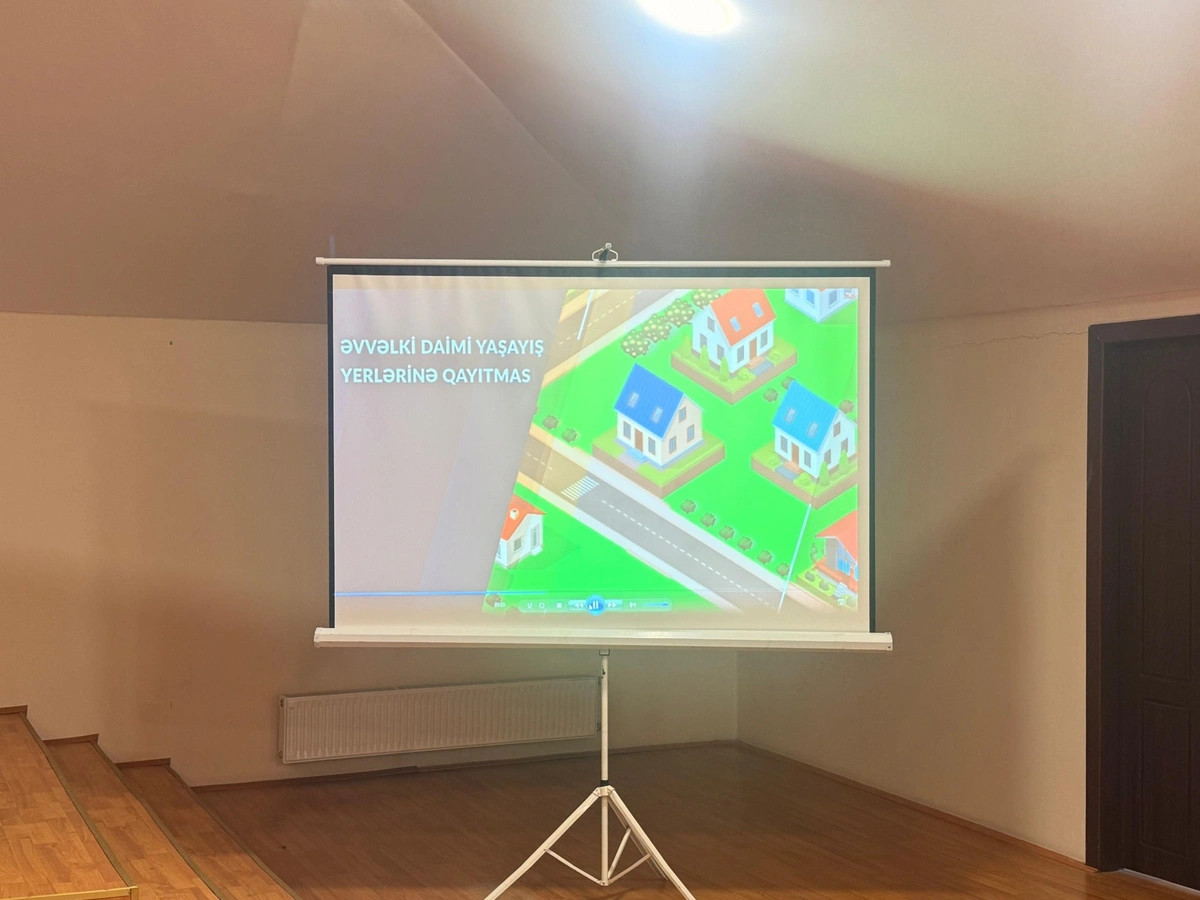 Dövlət Komitəsində keçirilən tədbirdə məcburi köçkünlərin sosial müdafiəsi məsələləri və vahid aylıq müavinətin daimi yaşayış yerinə geri qayıtmış şəxslərin üç il müddəti başa çatdıqdan sonra dayandırılacağı və mina təhlükəsi haqqında hazırlanmış videoçarxlar məcburi köçkünlər üçün nümayiş etdirilib.