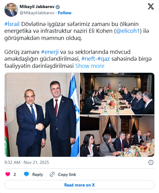 "İsrail Dövlətinə işgüzar səfərimiz zamanı bu ölkənin energetika və infrastruktur naziri Eli Kohen ilə görüşməkdən məmnun olduq",- deyə nazir qeyd edib.
