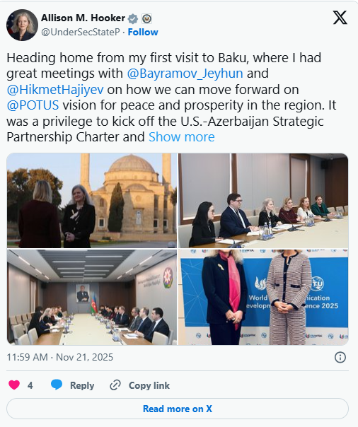 Crossmedia.az-ın məlumatına görə, "X" hesabında bu barədə yazan A.Huker, səfər çərçivəsində xarici işlər naziri Ceyhun Bayramov, Azərbaycan Prezidentinin köməkçisi – Prezident Administrasiyasının Xarici siyasət məsələləri şöbəsinin müdiri Hikmət Hacıyevlə görüşdüyünü qeyd edib.