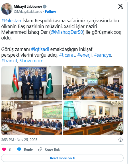 "Pakistan İslam Respublikasına səfərimiz çərçivəsində bu ölkənin Baş nazirinin müavini, xarici işlər naziri Məhəmməd İshaq Dar ilə görüşmək xoş oldu",- deyə nazir qeyd edib.