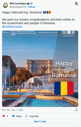 Azərbaycanın Xarici İşlər Nazirliyi (XİN) Rumıniyanı milli bayramı münasibətilə təbrik edib.