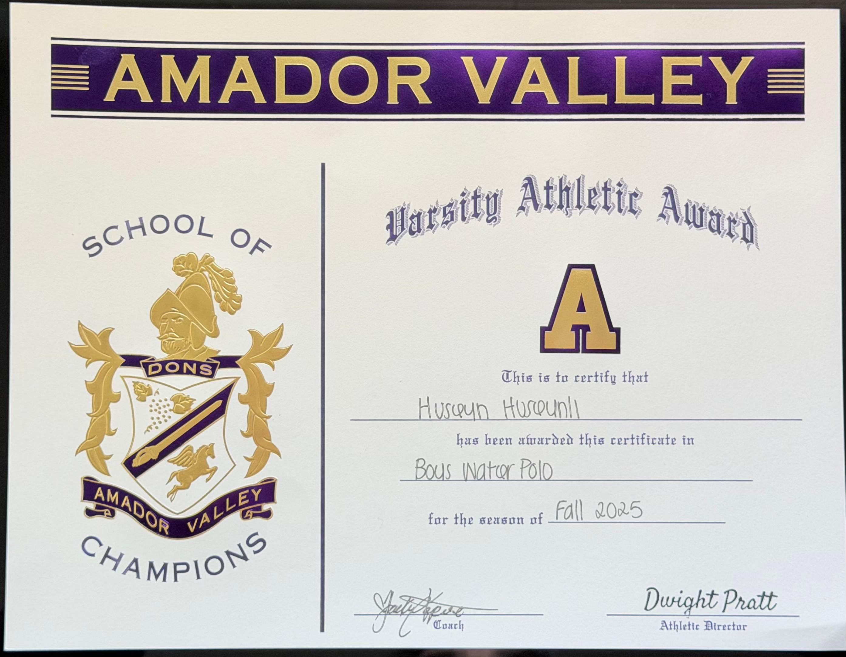 Dörd il üzgüçülük və altı il su polosu üzrə hazırlıq keçən gənc idmançı Şərq Körfəzi Atletika Liqası (East Bay Athletic League) üzrə “Vaterpol çempionu” adına layiq görülüb. O, “Junior Varsity (JV)” komandasının qapıçısı kimi bu yüksək adı əldə edən üç idmançıdan biri olub.