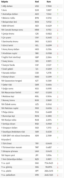 Azərbaycan Mərkəzi Bankı bu günün valyuta məzənnələrini açıqlayıb.