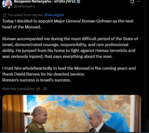 İsrail Baş naziri Benyamin Netanyahu kəşfiyyat xidməti olan "Mossad"ın yeni direktoru general-mayor Roman Qofman barəsində yeni faktlar açıqlayıb.