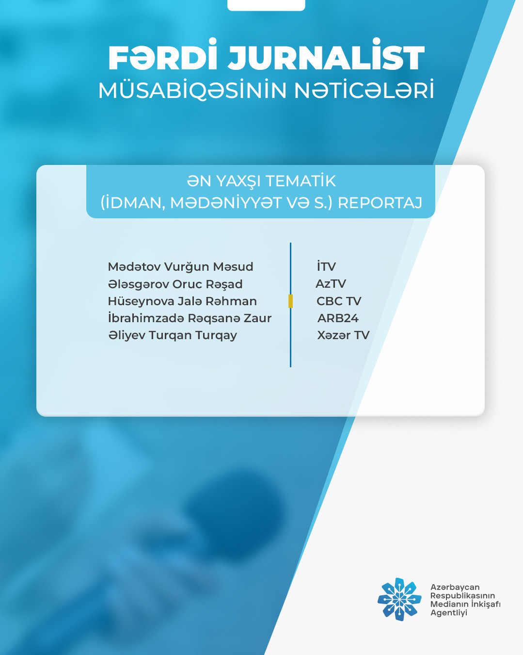 Medianın İnkişafı Agentliyinin (MEDİA) 30 oktyabrda elan etdiyi "Fərdi jurnalist müsabiqəsi"nin nəticələri açıqlanıb.