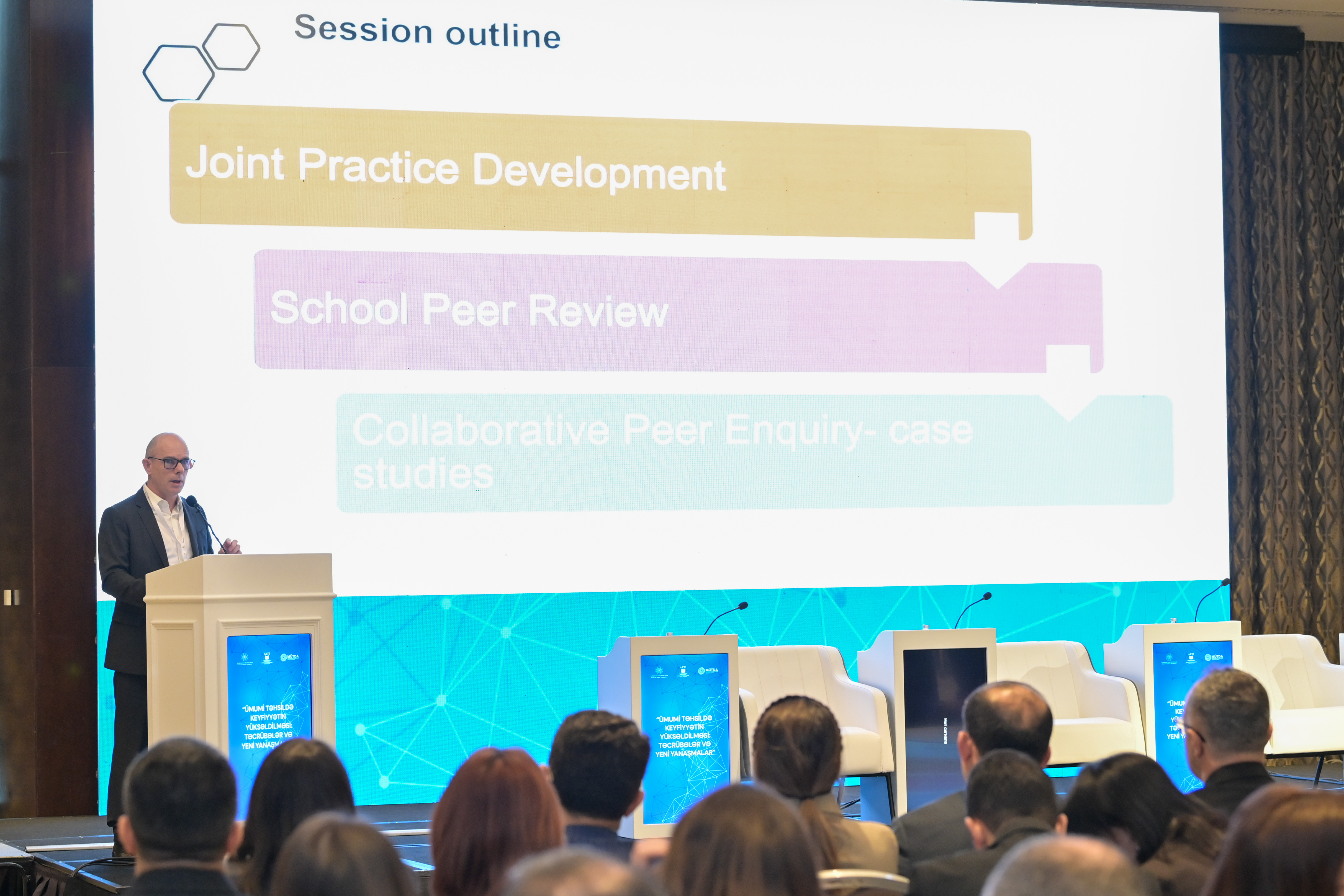 Konfransın əsas məruzələri çərçivəsində London Universitet Kollecinin (UCL) Təhsil Liderliyi və İdarəedilməsi üzrə dosenti Devid Qodfrey “Peşəkar inkişaf və məktəb inkişafı üçün birgə öyrənmə” mövzusunda çıxış edib. Devid Qodfrey bildirib ki, ənənəvi sistem fərdi öyrənməyə fokuslanır. Yeni yanaşmada isə komandalar və şəbəkələrin öyrənməsi vacibdir. Ənənəvi yanaşma təşkilati sabitliyə əsaslanır, halbuki yeni dövrdə dəyişikliklərlə yanaşı, davamlılıq da vacibdir. Ənənəvi planlaşdırma qısamüddətli hədəflərə yönəlib. İndi təşkilati yenilənmə və davamlı inkişaf əsas hədəfdir.