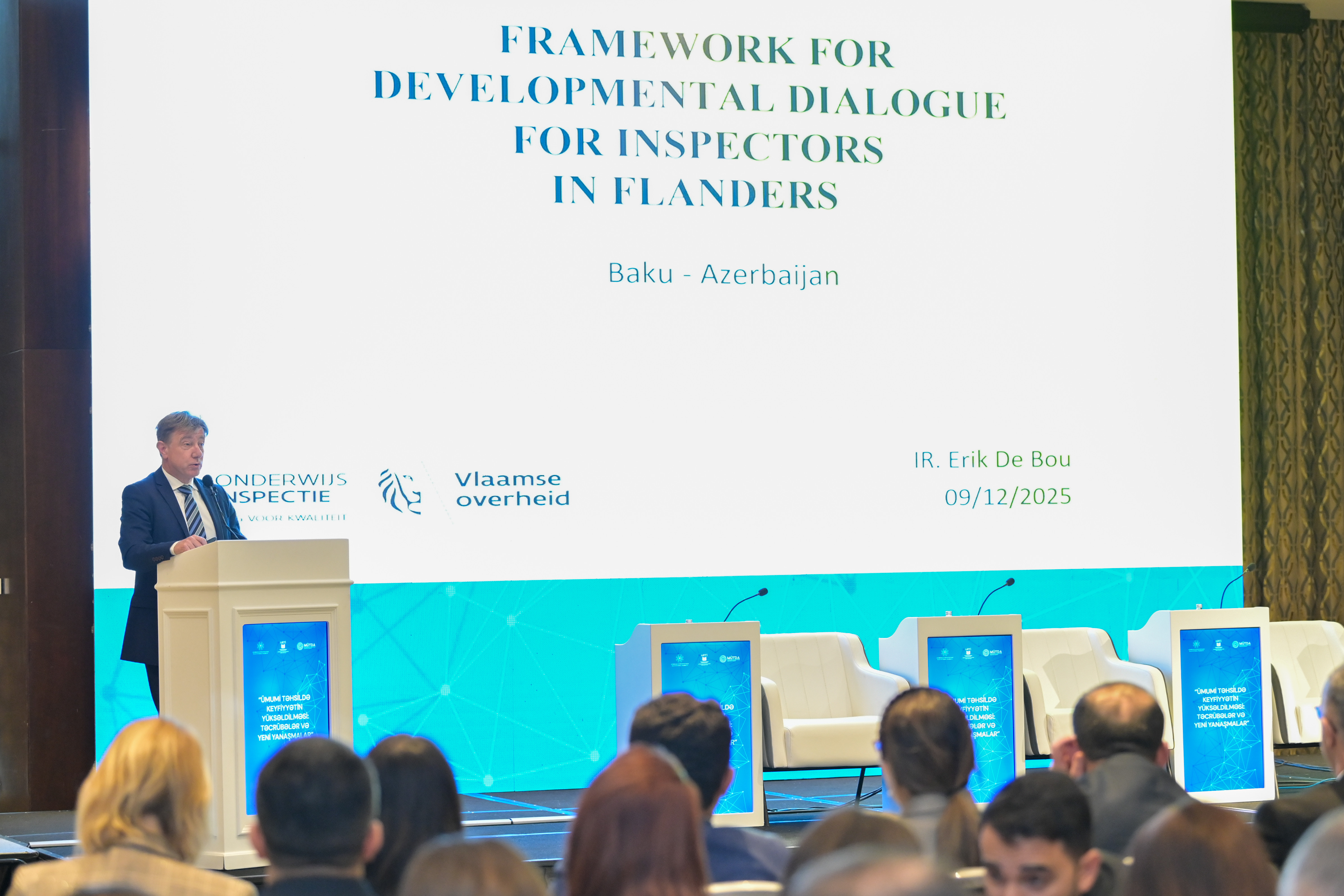 Beynəlxalq ekspert, Məktəb İnspektorluqlarının Daimi Konfransının (SİCİ) inkişaf üzrə rəhbəri Erik De Bou isə “İnspeksiya prosesində aydın çərçivə və inkişafyönümlü ünsiyyətin məktəb fəaliyyətinin obyektiv dəyərləndirilməsinə və məktəb inkişafına verdiyi töhfə” mövzusunda məruzə təqdim edib. Məktəblərdə keyfiyyətin təmin olunması və qiymətləndirilməsi üçün hazırlanmış çərçivədən danışan xarici mütəxəssisin sözlərinə görə, bu çərçivənin mərkəzində şagirdin inkişafı dayanır. Şagirdin inkişafını isə tədris prosesi, təhsil məqsədləri, monitorinq və yönləndirmə (guidance), məktəbin inkişaf keyfiyyəti, həmçinin maliyyə və maddi resursların idarə olunması əhatə edir.