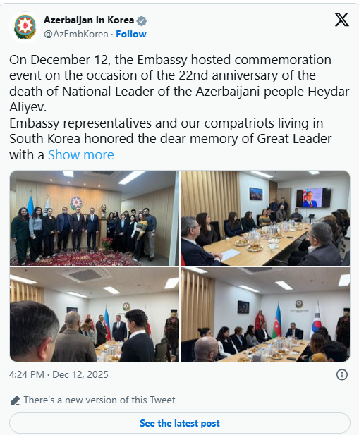 "Dekabrın 12-də səfirlikdə Azərbaycan xalqının Ümummilli Lideri Heydər Əliyevin vəfatının 22-ci ildönümünə həsr olunmuş tədbir keçirilib. Səfirliyin əməkdaşları və Cənubi Koreyada yaşayan həmvətənlərimiz Ulu Öndərin xatirəsini bir dəqiqəlik sükutla yad ediblər", - səfirliyin məlumatında bildirilib.
