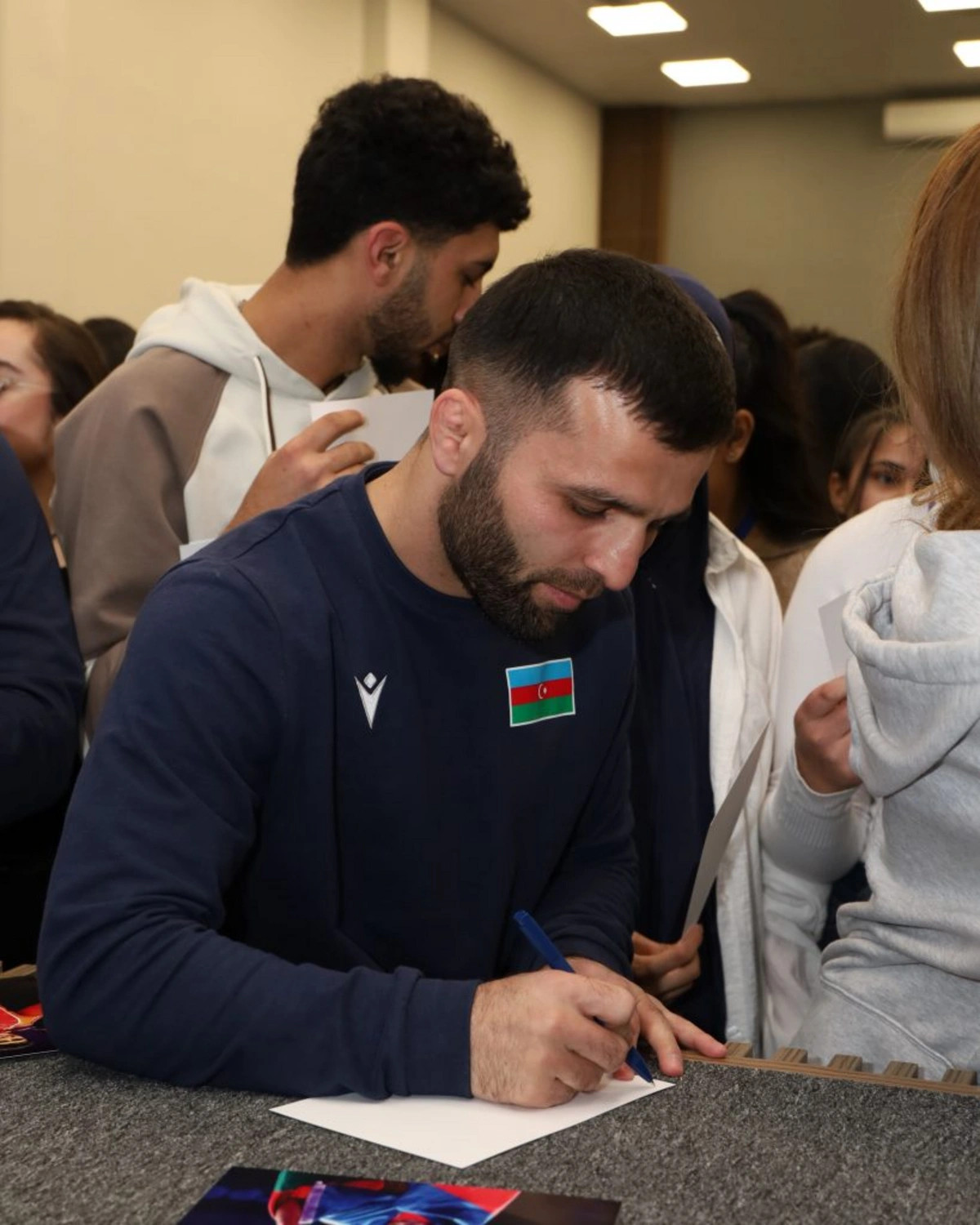 Daha sonra tələbələr güləşçilərə müxtəlif suallar ünvanlayıb və onlardan avtoqraf alıb. Sonda xatirə şəkli çəkdirilib.