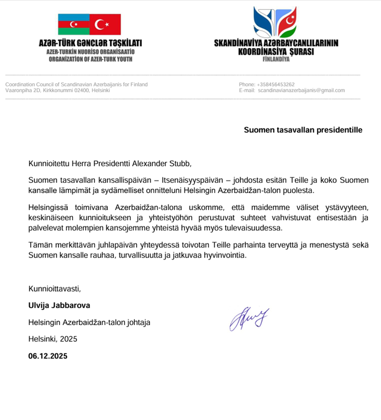 Helsinki Azərbaycan Evinin rəhbəri Ülviyyə Cabbarova müstəqillik günü münasibətilə Finlandiya Respublikasının Prezidenti Aleksandr Stubba təbrik məktubu ünvanlayıb. Məktubda iki ölkə arasında dostluğun, qarşılıqlı anlaşmanın və mədəni əməkdaşlığın gələcəkdə daha da güclənəcəyinə inam ifadə olunub. Finlandiya hökumətinə və xalqına sülh, təhlükəsizlik və davamlı rifah arzulanıb.