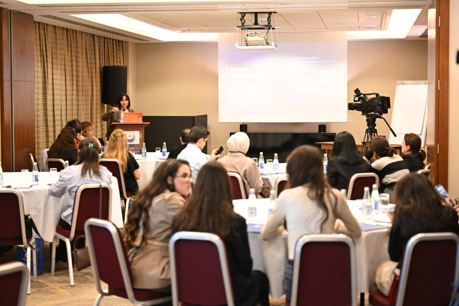 Təlimçi, “Ümidli Gələcək Sosial Təşəbbüslər” İctimai Birliyinin rəhbəri Kəmalə Aşumova təqdimatla çıxış edərək, məlumatların hazırlanmasında uşaqyönümlü yanaşmanın mahiyyəti, uşaqların zərərli informasiyadan qorunması mexanizmləri barədə danışıb. O, medianın uşaq hüquqlarının qorunmasında və ictimai məlumatlılığın artırılmasında mühüm rol oynadığını vurğulayaraq, jurnalistlərin bu mövzulara həssas yanaşmasının vacibliyini qeyd edib.