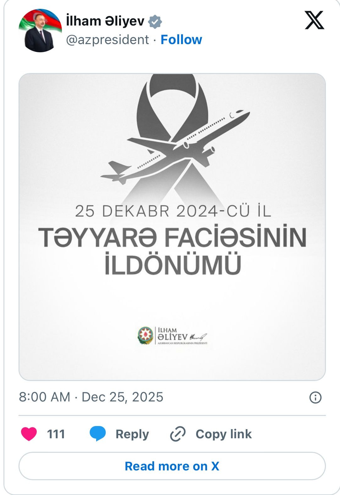 Azərbaycan Prezidenti İlham Əliyev "Azərbaycan Hava Yolları"na məxsus "Embraer 190" təyyarəsinin qəzaya uğramasının birinci ildönümü ilə bağlı sosial media hesablarında paylaşım edib.