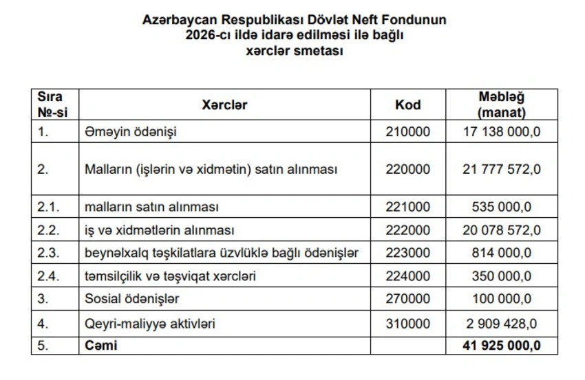 Dövlət Neft Fondunun (ARDNF) 2026-cı ildə idarə edilməsi ilə bağlı xərclər smetası məlum olub.