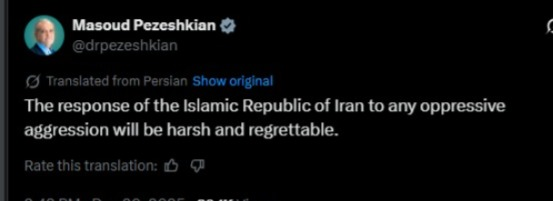 Crossmedia.az xəbər verir ki, o, bu barədə "X"də yazıb: "İran İslam Respublikasının istənilən zülmkar təcavüzə qarşı cavabı sərt olacaq və təəssüf doğuracaq".