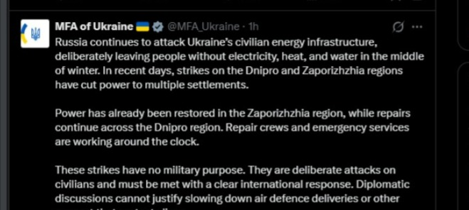 "Rusiya Ukraynanın mülki enerji infrastrukturuna hücum etməyə davam edir və qışın ortasında insanları qəsdən elektrik işıqsız və susuz qoyur. Son günlərdə Dnepr və Zaporojye bölgələrinə edilən hücumlar bir çox yaşayış məntəqəsinin elektrik enerjisini kəsib".