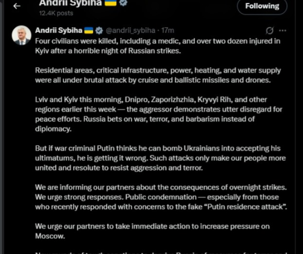 "Bu səhər Lvov və Kiyev, Dnepr, Zaporojye, Krivoy Roq və bu həftənin əvvəlində digər bölgələr — təcavüzkar sülh səylərinə tamamilə etinasızlıq nümayiş etdirir. Rusiya diplomatiya əvəzinə müharibəyə, terrora və barbarlığa pul qoyur. Lakin müharibə cinayətkarı Putin (Red: Rusiya dövlət başçısı Vladimir Putin) ukraynalıları ultimatumlarını qəbul etdirmək üçün bombalaya biləcəyini düşünürsə, səhv edir. Bu cür hücumlar xalqımızı daha birləşdirir və təcavüzə və terrora müqavimət göstərməkdə qətiyyətlidir. Tərəfdaşlarımızı gecə hücumlarının nəticələri barədə məlumatlandırırıq. Xüsusilə də bu yaxınlarda saxta "Putinin iqamətgahına hücum"a narahatlıqla cavab verənlərdən ictimai qınaq tələb edirik".