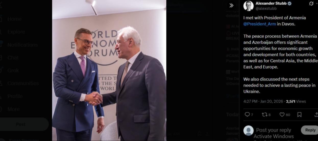 Crossmedia.az xəbər verir ki, bunu Finlandiya Prezidenti Aleksandr Stubb ermənistanlı həmkarı Vaaqn Xaçaturyanla Davos İqtisadi Forumu çərçivəsində görüşlə bağlı "X" hesabında yazıb.