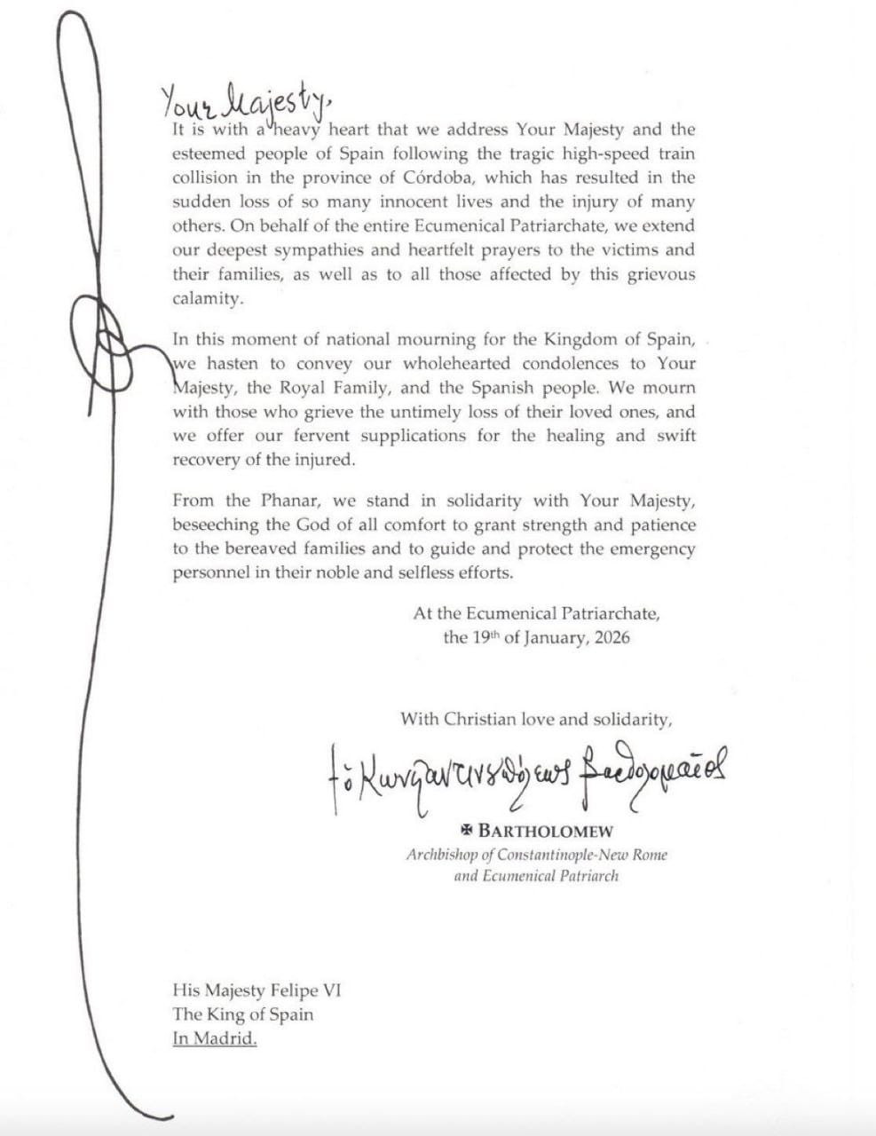 İstanbul Rum Fənər Patriarxı Bartolomey İspaniya Kralına məktubunda özünü “Konstantinopol-Yeni Roma Baş Yepiskopu və Ümumdünya Patriarxı” kimi təqdim edib.