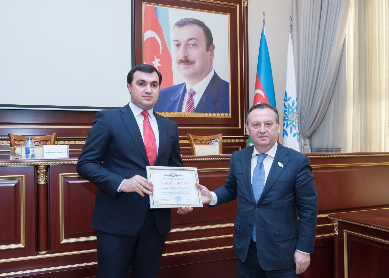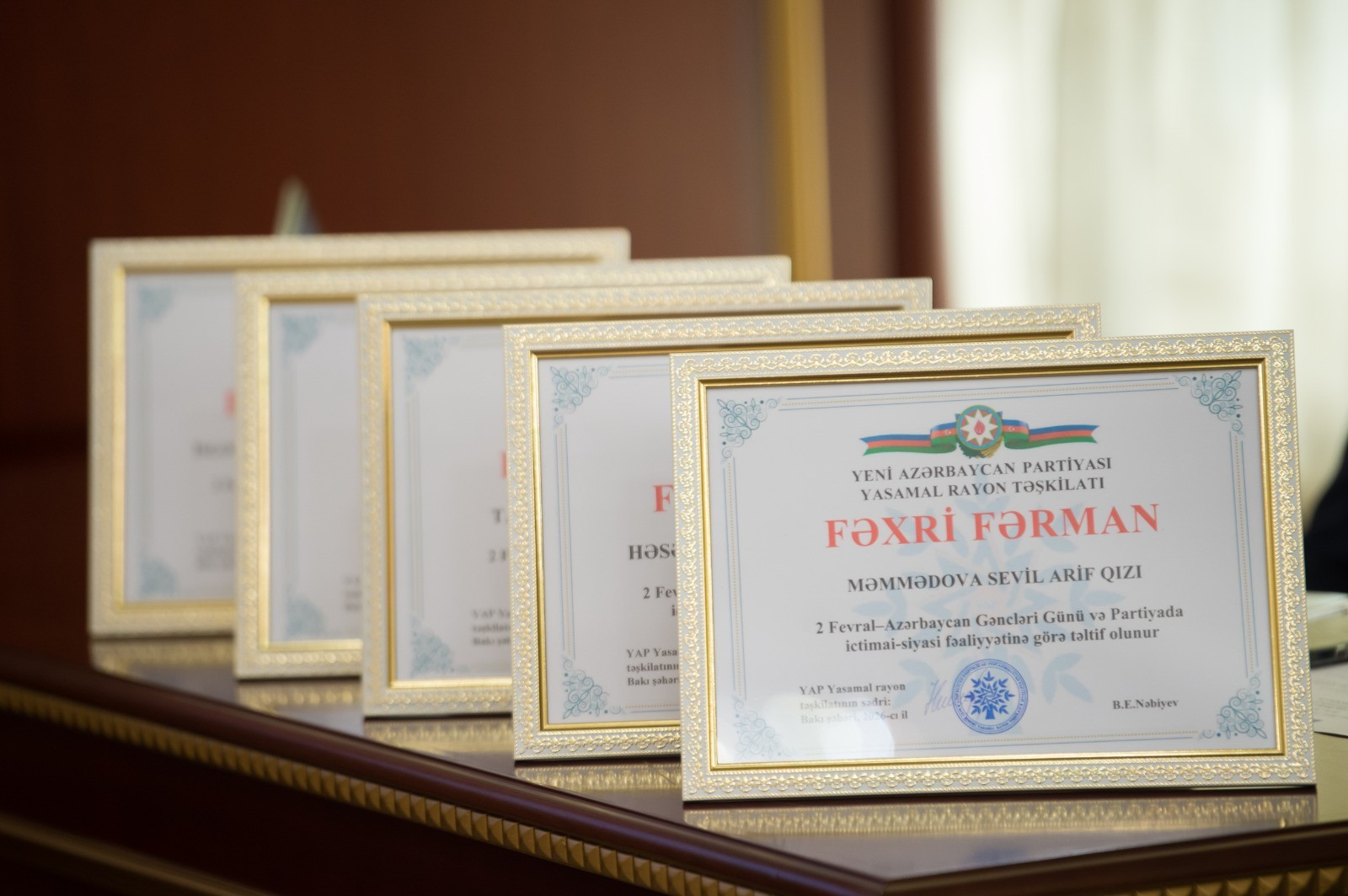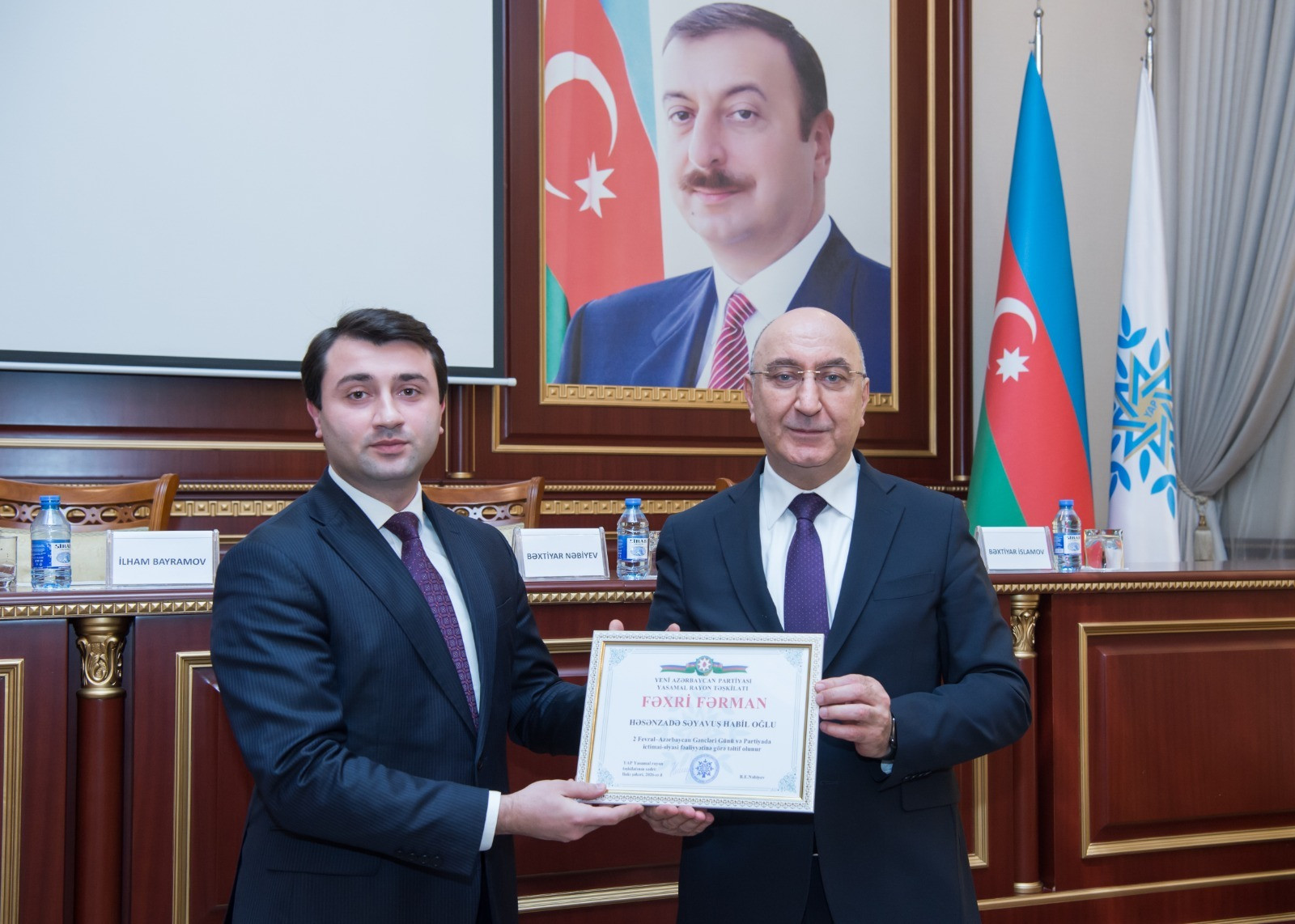Tədbirdə 2 Fevral-Azərbaycan Gəncləri Günü münasibətilə və Partiyanın ictimai-siyasi həyatında fəal iştirak edən partiya üzvlərinə fəxri fərmanlar,