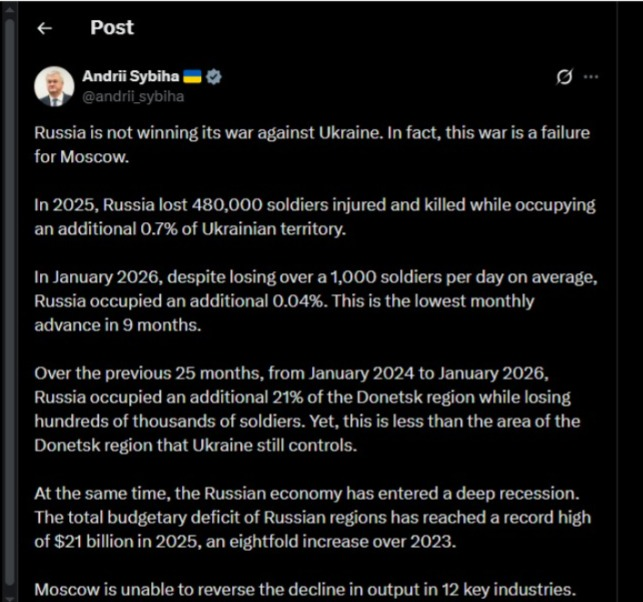 O, həmçinin Rusiya iqtisadiyyatının dərin tənəzzülə qədəm qoyduğunu iddia edib: "Rusiya bölgələrinin ümumi büdcə kəsiri 2025-ci ildə rekord həddə - 21 milyard dollara çatıb ki, bu da 2023-cü illə müqayisədə səkkiz dəfə çoxdur. Moskva 12 əsas sənayedə istehsalın azalmasını geri qaytara bilmir. Bunun əvəzinə, vergiləri artırır. 2025-ci ildə Rusiya bizneslərinin 15% daha çoxu bağlanıb, daha 10% isə bağlanmaq üzrədir. Rusiyanın büdcə planlaşdırmasının qeyri-kafi olması daha böyük büdcə boşluqlarına səbəb olacaq. Rusiya Maliyyə Nazirliyinin rəqəmləri ilə reallıq arasındakı fərq bu il Rusiya büdcəsinin neft gəlirlərinin ən azı 25 milyard dollar azalmasına səbəb olacaq. Digər tərəfdən, Ukrayna Rusiya daxilindəki qanuni hərbi hədəflərə qarşı dərin zərbə kampaniyasını gücləndirir. 2025-ci ildə 15 milyard dollar ziyana səbəb olan 719 belə zərbə olub. Kampaniya davam edəcək. Müharibə yenidən yarandığı yerə - Rusiyaya qayıdır. Və bu, ədalətlidir".