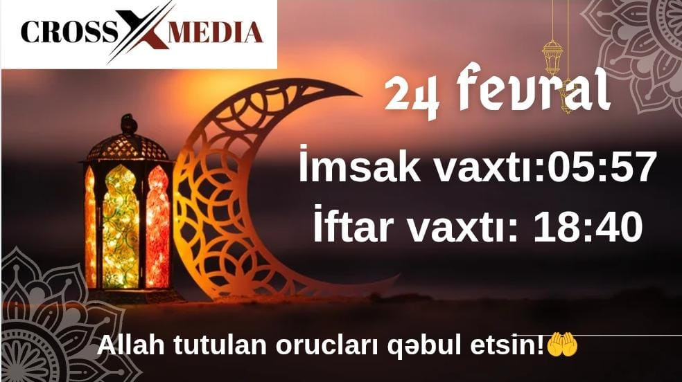 Crossmedia.az xəbər verir ki, imsak vaxtı 05:57 , iftar isə 18:40-a təyin olunub.