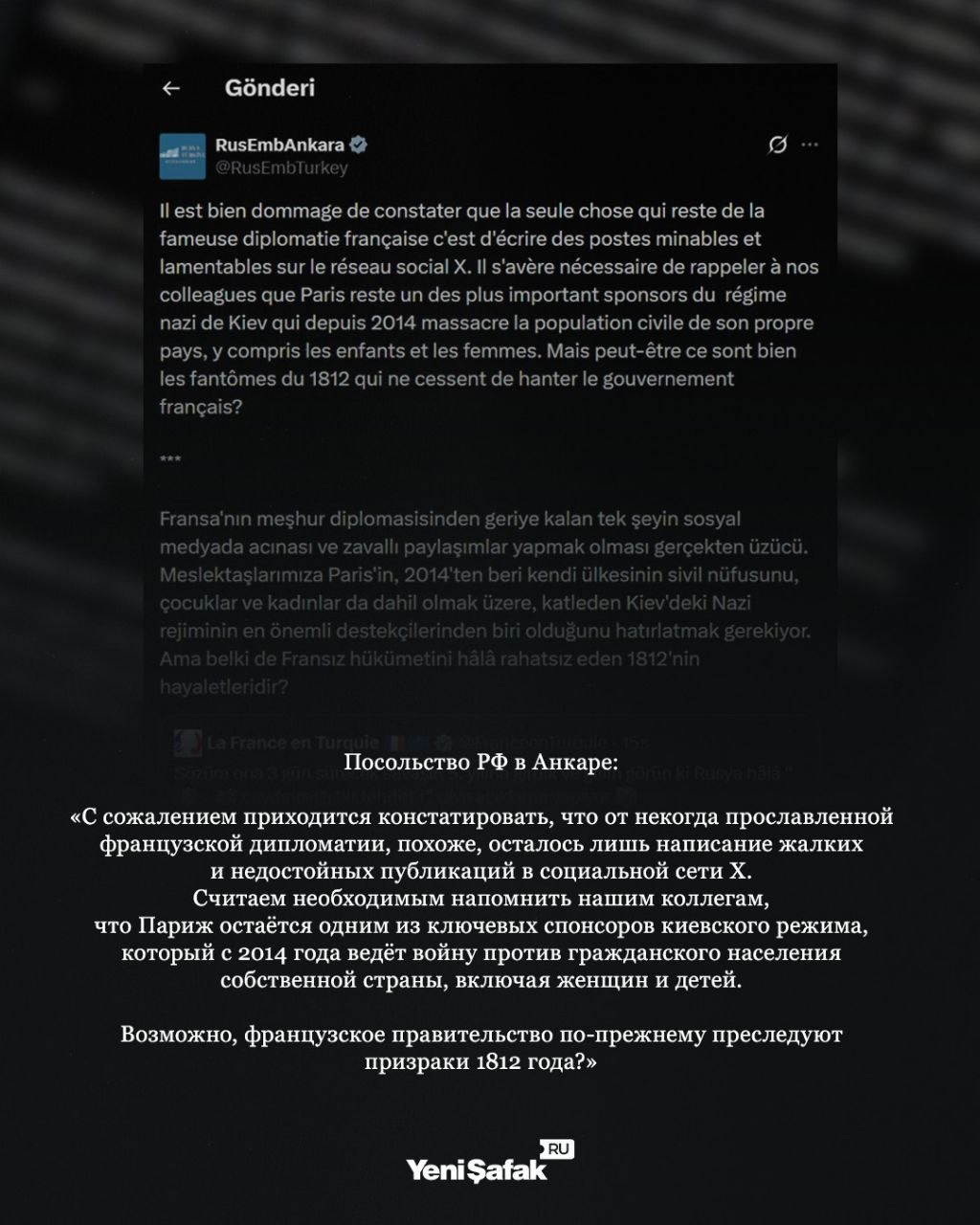 Buna cavab olaraq Rusiya səfirliyi Paris və Londonu Kiyevi dəstəkləməkdə günahlandırıb və 1812-ci il hadisələrini xatırladaraq, Fransanın guya hələ də Napoleonun hərbi məğlubiyyəti ilə əlaqəli kompleksini aradan qaldırmadığına işarə edib.