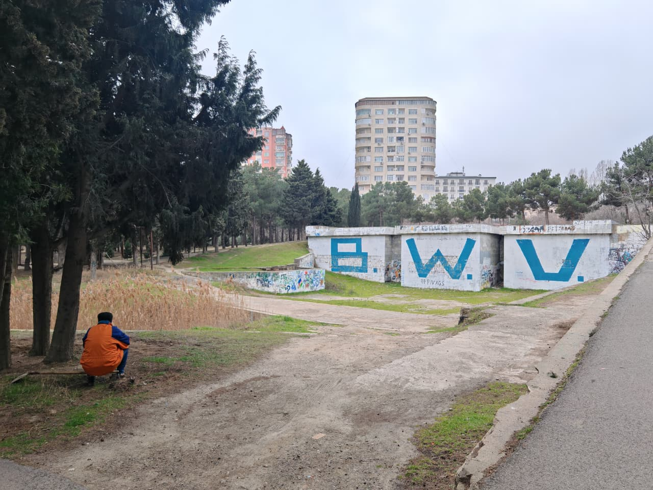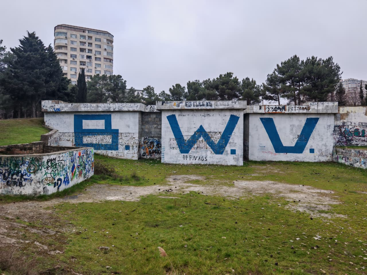 Fotolarda diqqət çəkən ən maraqlı məqamlardan biri beton konstruksiyaların üzərindəki iri, mavi rəngli "B. W. V." hərfləridir. Bu qrafiti, tərk edilmiş məkana müasir bir "küçə incəsənəti" ruhu qataraq, keçmişlə bu günün toqquşmasını nümayiş etdirir.