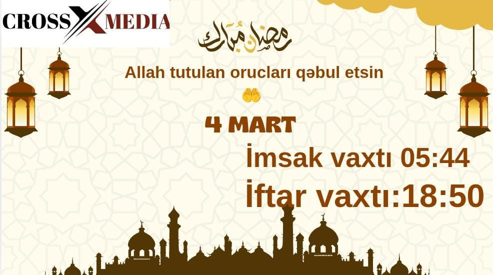Crossmedia.az xəbər verir ki, imsak vaxtı 05:44 , iftar isə 18:50-yə təyin olunub.