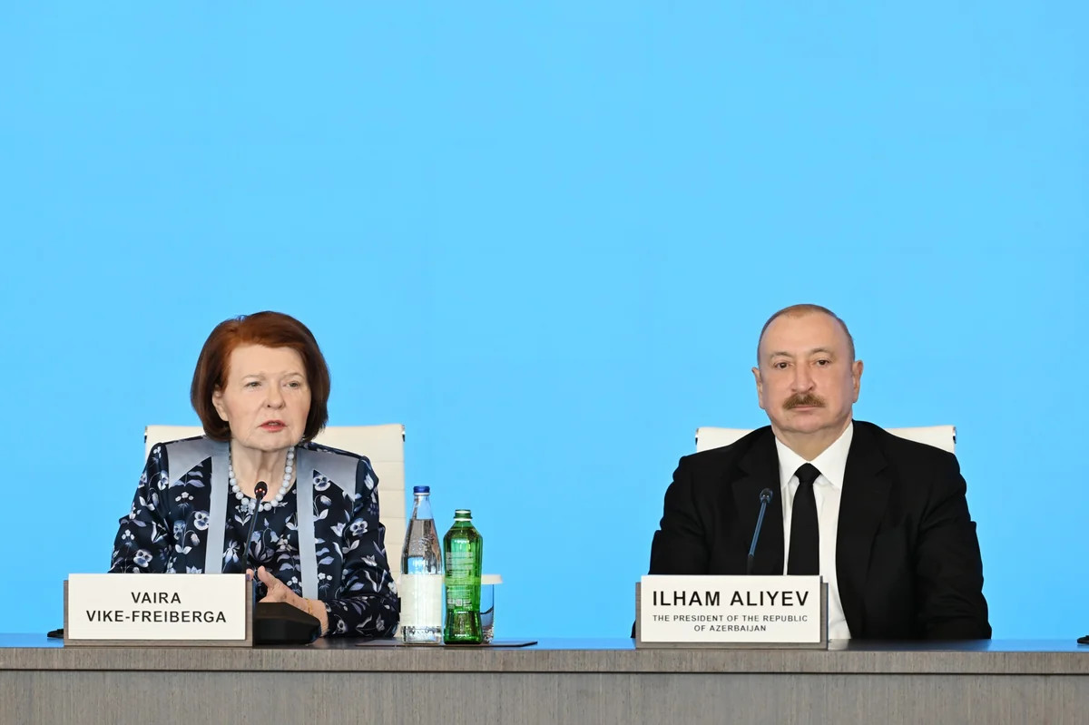Daha sonra çıxış edən Latviyanın sabiq Prezidenti, Nizami Gəncəvi Beynəlxalq Mərkəzinin həmsədri Vayra Vike-Freyberqa Forumun dünyanın qlobal çağırışları ilə bağlı fikir mübadiləsi aparılmasına geniş imkan yaratdığını qeyd edərək dedi: "İstərdim, mən də Nizami Gəncəvi Beynəlxalq Mərkəzinin Qəyyumlar Şurasını salamlama fikirlərinə qatılım və Sizin burada olmağınızdan məmnunluğumu ifadə edim. Eyni zamanda, biz Azərbaycan Respublikasına təşəkkürümüzü bildiririk ki, artıq 13-cü dəfədir bu Foruma ev sahibliyi edir və Prezident İlham Əliyev də çıxışında bu tədbirin əhəmiyyətini qeyd etdi. Xatırlayıram ki, bir çox il əvvəl biz bu təşəbbüsə başlayanda ideya ilə Prezident qarşısında çıxış etdik və Prezident Nizami Gəncəvinin doğum günü ilə əlaqədar tədbirə dəvət etdi və hər il bu tədbirlərin keçirilməsinin əhəmiyyətini qeyd etdi, dedi ki, Azərbaycan bu tədbirə ev sahibliyi etməlidir. Cənab Prezident bizim o vaxt keçirdiyimiz tədbirdən daha böyük tədbirlərin Azərbaycanda keçirilməsinin təşəbbüsünü irəli sürdü və hazırda bu gün miqyas doğrudan da böyükdür".