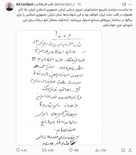İranın Ali Milli Təhlükəsizlik Şurasının katibi Əli Laricaninin ABŞ Hərbi Dəniz Qüvvələrinin Şri-Lanka sahillərində ölkənin “IRIS Dena” hərbi gəmisinə hücumu nəticəsində həlak olan iranlı dənizçilərə başsağlığı məktubu paylaşılıb.