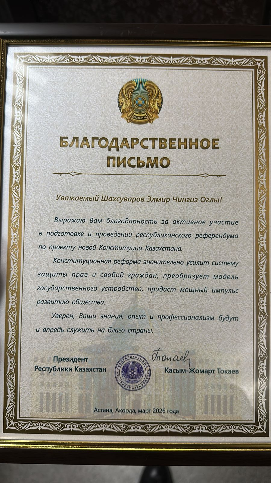 Qazaxıstan prezidenti Kasım-Jomart Tokayev azərbaycanlı ictimai fəal Elmir Şahsuvarova Qazaxıstanın yeni Konstitusiya layihəsi üzrə ümumxalq referendumunun hazırlanmasında və keçirilməsində fəal iştirakına görə təşəkkür məktubu göndərib.