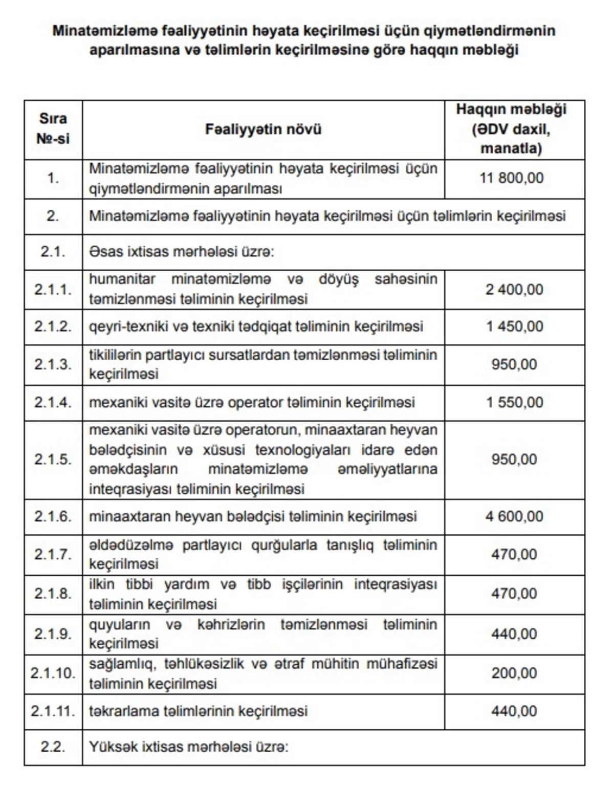 Nazirlər Kabineti "Minatəmizləmə fəaliyyətinin həyata keçirilməsi üçün qiymətləndirmənin aparılmasına və təlimlərin keçirilməsinə görə haqqın məbləği"ni təsdiq edib.